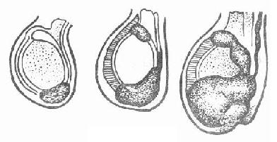 2、阴囊部可见梨形或椭圆形肿块,囊性,透光试验(+),如合并感染则透光试验(-)。